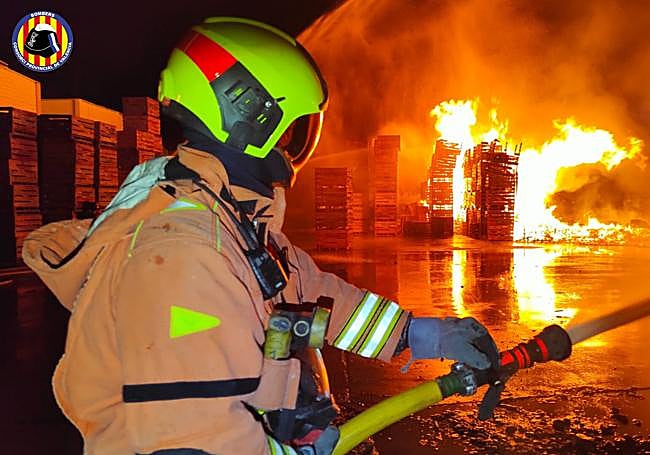 Ocho dotaciones de bomberos han estado trabajando durante toda la madrugada en la extinción de un incendio industrial que se producía en la Pobla de Vallbona. El fuego se inició sobre las doce y media de la madrugada de este jueves en una explanada de palés, perteneciente a una empresa del sector alimentario, ubicada junto a la carretera Valencia-Ademuz.