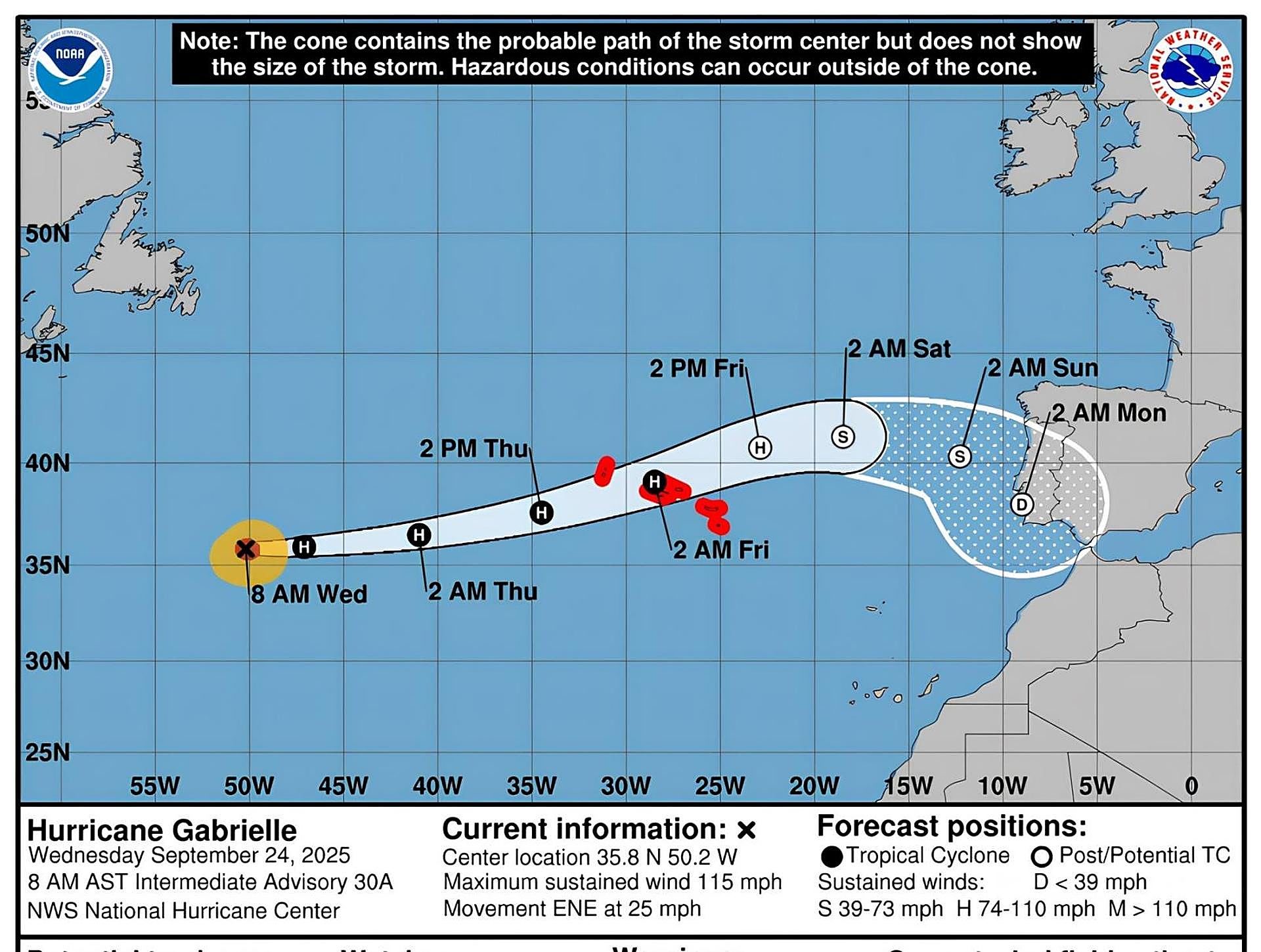 Samuel Biener, climatólogo de Meteored, explica que en la recta final de esta semana 'Gabrielle' se transformará en una borrasca más típica de estas latitudes, tras atravesar las Azores con rachas de viento de unos 200 kilómetros por hora (km/h) y dejar a su paso lluvias y tormentas intensas y un temporal de mar «bastante duro» en el archipiélago portugués, al que impactará con categoría 3.