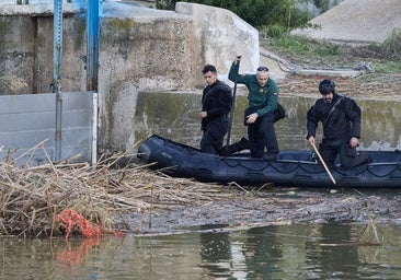 Guardias Civiles peinan una partida agrícola cruzando los mapas con la información aportada por la Politècnica de los sitios más probables hasta los que pudo llevarlo el agua del Magro