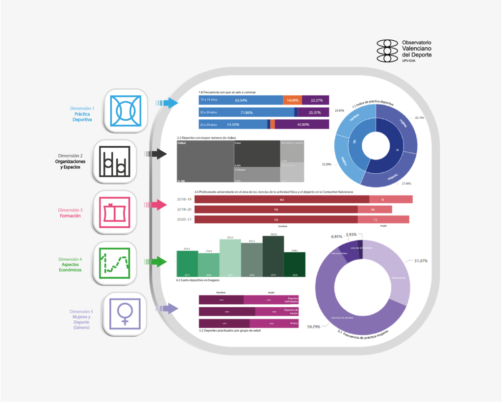 En primer lugar, el Observatorio Valenciano del Deporte se ha convertido en una pieza clave para el análisis, diagnóstico y toma de decisiones en el ámbito deportivo. Proporciona datos abiertos y accesibles sobre el deporte en la Comunitat, genera nueva información, identifica tendencias emergentes y brinda apoyo a actores sociales y administraciones públicas en la formulación de estrategias y programas de política deportiva.
