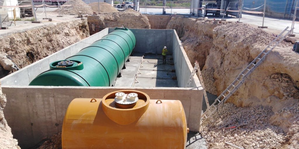 Nuestra intervención abarca desde la obra civil completa, incluyendo movimientos de tierras, cimentaciones, cubiertas y urbanización exterior, hasta trabajos más específicos como la instalación de cubetos, canalizaciones, depósitos enterrados, marquesinas, etc.