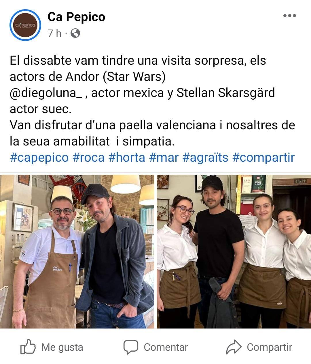 «El sábado tuvimos una visita sorpresa, los actores de 'Andor' (Star Wars) Diego Luna y Stellan Skarsgärd disfrutaron de una paella valenciana y nosotros ... de su amabilidad y simpatía». Este fue el post que en la noche del lunes 3 de abril compartió Ca Pepico de Meliana en su perfil de Facebook. El restaurante emplazado en la huerta valenciana muestra en las redes sociales dos fotografías del intérprete mexicano con Pep Ferrer, responsable del local, y con parte de la plantilla del establecimiento.