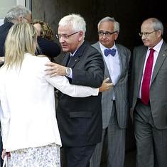 El conseller de Cultura Ferran Mascarell (i), el poeta y lingüista Carles Duarte (c) y el expresident José Montilla (d) saludan a los familiares de la escritora Ana María Matute.