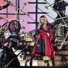 Samuráis, equilibristas, monjas con poca ropa, guiños sexuales, coreografías espectaculares y toreros. Todo eso y mucho más ha ofrecido Madonna en su concierto en Barcelona, donde ha demostrado que sigue en plena forma y dispuesta a seguir reinando en el mundo del pop. En el primero de los dos conciertos de Barcelona, única parada española de este gira, la diva ha conquistado al público y ha conseguido hacerle olvidar el frío que ha pasado en la larga cola formada para acceder al recinto.