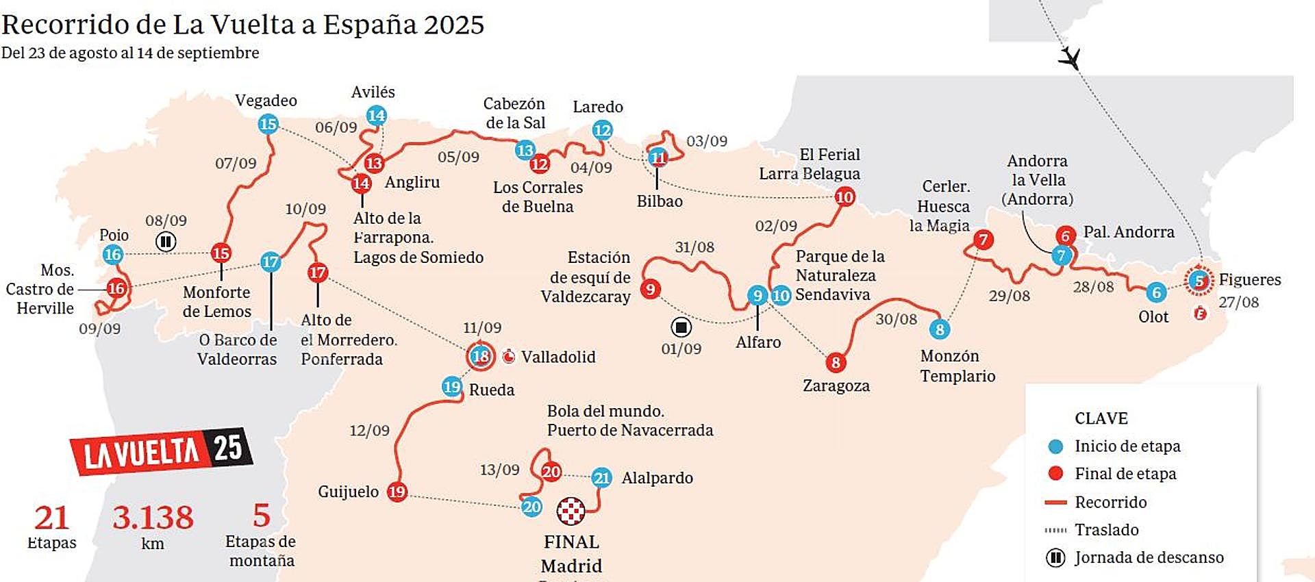 Hasta la etapa 5 no se entra en territorio español: antes se ha pasado por Italia (3 etapas) y Francia (1) y después se visita Andorra durante dos días. La Vuelta 2025 se compone de 21 etapas, cubre una distancia total de 3.138 kilómetros y, por mucho que se quiera, no da tiempo a visitar muchas zonas de España. Por este motivo este año se limita a la mitad norte de España y no pasará de Madrid hacia el sur. La Vuelta no pasará por la Comunitat Valenciana, ni por Andalucía, Castilla la Mancha o Extremadura. Pisa ligeramente Cataluña y se concentra sobre todo en el norte, con etapas espectaculares.