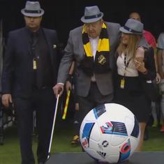 Los jugadores del AIK Solna salieron al campo acompañados por aficionados ancianos encabezados por el expresidente de la UEFA Lennart Johansson
