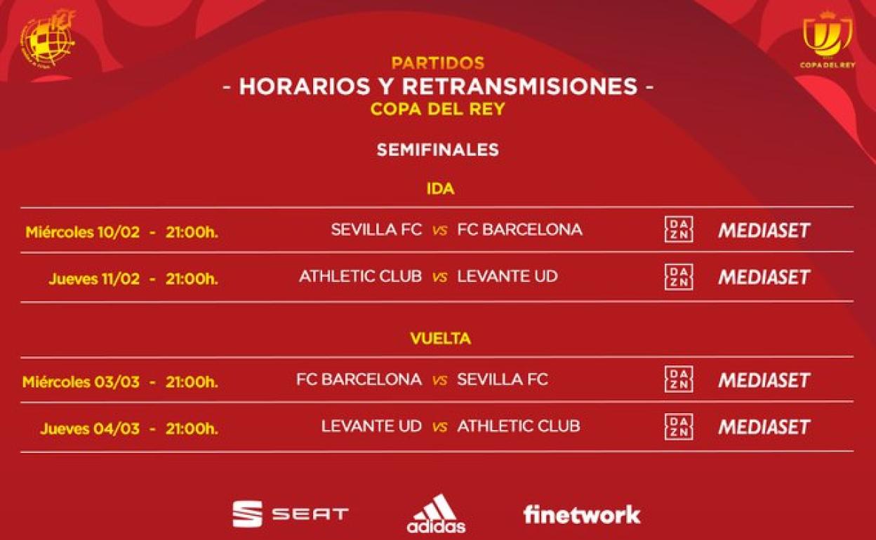 Sevilla-Barça y Athletic-Levante serán las semifinales de la Copa del Rey que se disputarán la semana del 10 de febrero (ida) y del 3 de marzo (vuelta). La final de la Copa 2020-2021 se jugará el 17 de abril en el estadio de La Cartuja, después de que el día 3 del mismo mes se dispute en el mismo escenario la que enfrentará al Athletic y la Real Sociedad, aplazada por la pandemia y correspondiente a la temporada anterior.