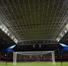 Vista del estadio Nacional de Gales desde detrás de una portería.