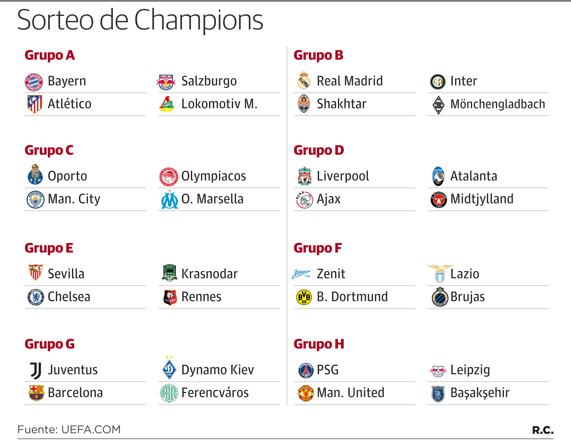 En esta ocasión, y más allá de los grupos de Real Madrid y Sevilla, el H se perfila como el más duro, con el actual subcampeón, París Saint-Germain; el Manchester United de Ole Gunnar Solskjaer, que quiere reverdecer viejos laureles en la Liga de Campeones; el RB Leipzig de Julian Nagelsmann, semifinalista el pasado curso; y el debutante Istanbul Basaksehir, que por ahora no podrá contar con su mayor fortaleza, el habitual entusiasmo de la afición turca. Los grandes de la Premier, el Liverpool y el Manchester City, se enfrentarán a Ajax, la revelación Atalanta y un nuevo, el Midtjylland danés, en el caso de los 'red', y a Oporto, Olympiacos y Olympique de Marsella los 'citizens'. Por último, el Borussia Dortmund parte como favorito en el grupo F, el a priori más igualado, con Zenit, Lazio y Brujas.