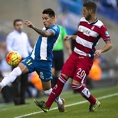 El centrocampista del Espanyol Hernán Asensio (i) y el centrocampista del Granada Rubén Pérez.