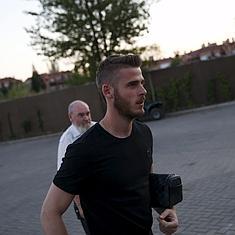 Vestido con un pantalón vaquero gris, una camiseta negra y unas zapatillas blancas camino hasta la residencia mientras sonaban los flashes de las todas las cámaras que apuntaban hacia él. Su compañero en el Manchester United Juan Mata llegó con otro buen amigo del portero, César Azpilicueta. El asturiano, como el resto de los internacionales, no quiso comentar nada de la situación de su vecino, algo que si hizo Sergio Ramos, que recordó la calidad del internacional absoluto aunque explicó: "No puedo decantarme por un jugador que no es de Real Madrid porque sería una falta de respeto a cualquiera de mis compañeros, que son dos grandes porteros".