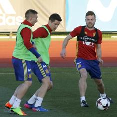 Los que jugaron el domingo (Javi Martínez, Iago Aspas, Busquets, Piqué, Iniesta, Silva, Koke, Vitolo) y algunos otros con molestias como Diego Costa, Carvajal y Ramos que sufrió un virus gástrico, se ejercitaron a menor ritmo. «Me lo pasó el enano (por su hijo) y me dejó como si me hubiese pasado el AVE por encima», bromeó el central del Real Madrid. Todos ellos apenas participaron quince minutos con el grupo y se limitaron a hacer una suave carrera continua. Apenas completaron 40 minutos de entrenamiento, al que acudieron más de un millar de espectadores debido a que era festivo para los escolares en Madrid. Varios de ellos, muy jóvenes, saltaron al césped cuando se retiraban los internacionales y provocaron las risas de los presentes al esquivar varias veces a los miembros de seguridad de las instalaciones.