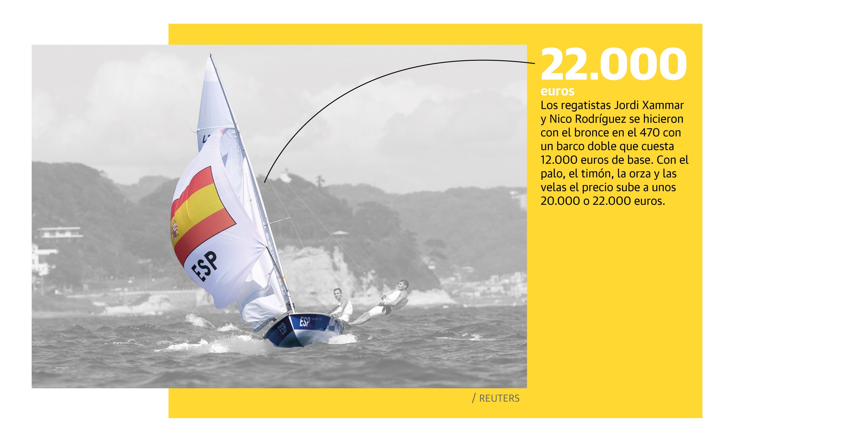En el caso de la vela, los regatistas Jordi Xammar y Nico Rodríguez consiguieron el bronce en el 470 con un barco doble que cuesta 12.000 euros de base. Con el palo, el timón, la orza y las velas el precio sube a unos 20.000 o 22.000 euros. No es la embarcación más cara de las 10 clases en las que compite la delegación española, ya que el precio en algunas de ellas alcanza los 45.000 euros. Por la parte de abajo, una tabla de windsurf RS:X como la que llevó Blanca Manchón ronda los 12.000 euros con todo el equipo necesario para competir a alto nivel: tabla, palo, botavara y vela; con sus recambios correspondientes.