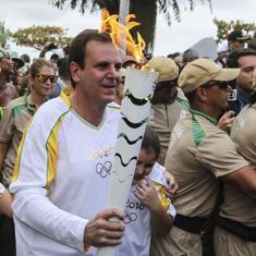 El alcalde de Río porta la antorcha olimpica entre grandes medidas de seguridad.