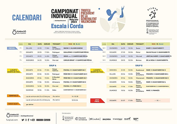 El Campionat Individual 2023 – Trofeu President de la Generalitat comenzará el 17 de mayo en el trinquet de Castelló de Rugat, en la modalidad de raspall, y el 26 de mayo en los trinquets de Sueca y Vila-real, en la disciplina de escala i corda.