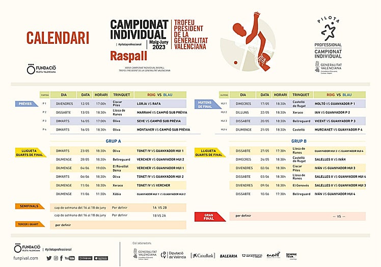 Las semifinales se jugarán durante el fin de semana del 23 al 25 con el mismo formato que en raspall de primero de un grupo contra el segundo del otro, en trinquetes que se determinarán más adelante.