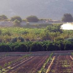 Sin embargo queda una gran asignatura pendiente en todo esto. La gran mayoría de los equipos actuales de pulverización son turboatomizadores que van equivados con hélices, las cuales mueven gran cantidad de aire que impulsa el caldo insecticida hacia las hojas de las plantas o árboles a tratar. Pero como resultado de ese fuerte movimiento aéreo se genera una nube que no acaba en su totalidad sobre el follaje vegetal sino que, por lo general, buena parte se pierde en la atmósfera. Miren la foto. Esa nube es el resultado habitual. No es un caso aislado, es generalizado. Evidentemente se pierde y contamina más que con cualquier goteo insignificante que, en cambio, puede ser causa de rechazo en la inspección.