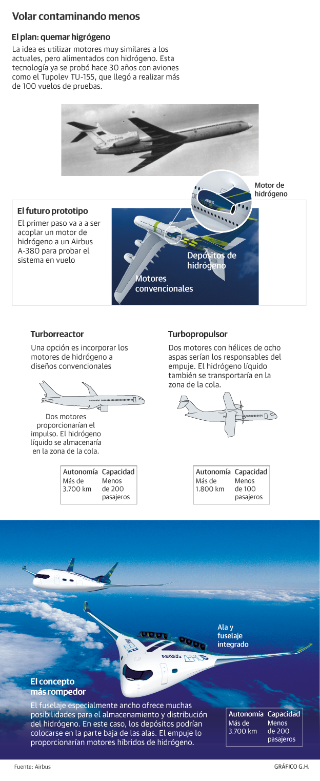 Airbus, que se disputa con Boeing la hegemonía mundial en la fabricación de aeronaves, ha presentado esta semana un acuerdo con el consorcio CFM para trabajar ya muy seriamente en una turbina de gas que se alimente de hidrógeno líquido. Eliminar el queroseno fósil es posible. El avión del futuro volará con hidrógeno. Pero por ahora es eso: el avión del futuro. Airbus no cree que hasta antes de 2035 pueda crear un prototipo capaz de propulsarse con este combustible ecológico. Va para largo.
