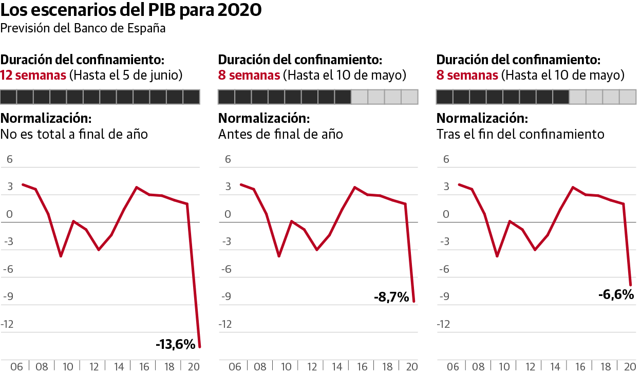 La crisis sanitaria global ha dado paso a una crisis económica mundial. El Banco de España reconoce que las medidas adoptadas para reducir las pérdidas de vidas humanas han conducido a la «paralización de parcelas importantes de la actividad y, por tanto, a una caída profunda y repentina del PIB». El organismo propone diferentes escenarios, dependiendo de la duración del confinamiento de la población y la vuelta a la normalidad de la actividad.
