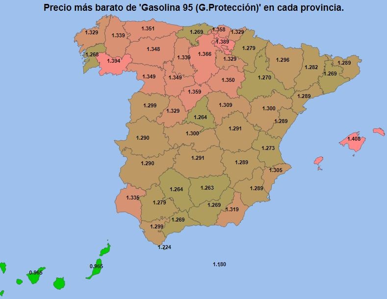 En cuanto a la gasolina Sin Plomo 95 las diferencias son menores que en el caso del diésel en la península. Canarias sigue siendo el lugar más barato (0.96 en Las Palmas y Tenerife, tras sufrir una ligera subida) y el precio más bajo en la Península se sitúa en 8 provincias, donde se vende a 1'26, tres céntimos más que hace unos días: Madrid, Córdoba, Jaén, Málaga, Granada, Barcelona, Cantabria y Pontevedra. Las provincias donde está por debajo de 1.30 ya sitúa en 27 y el precio más alto en las low-cost se paga en Baleares (1'40), tres céntimos más que hace apenas una semana.