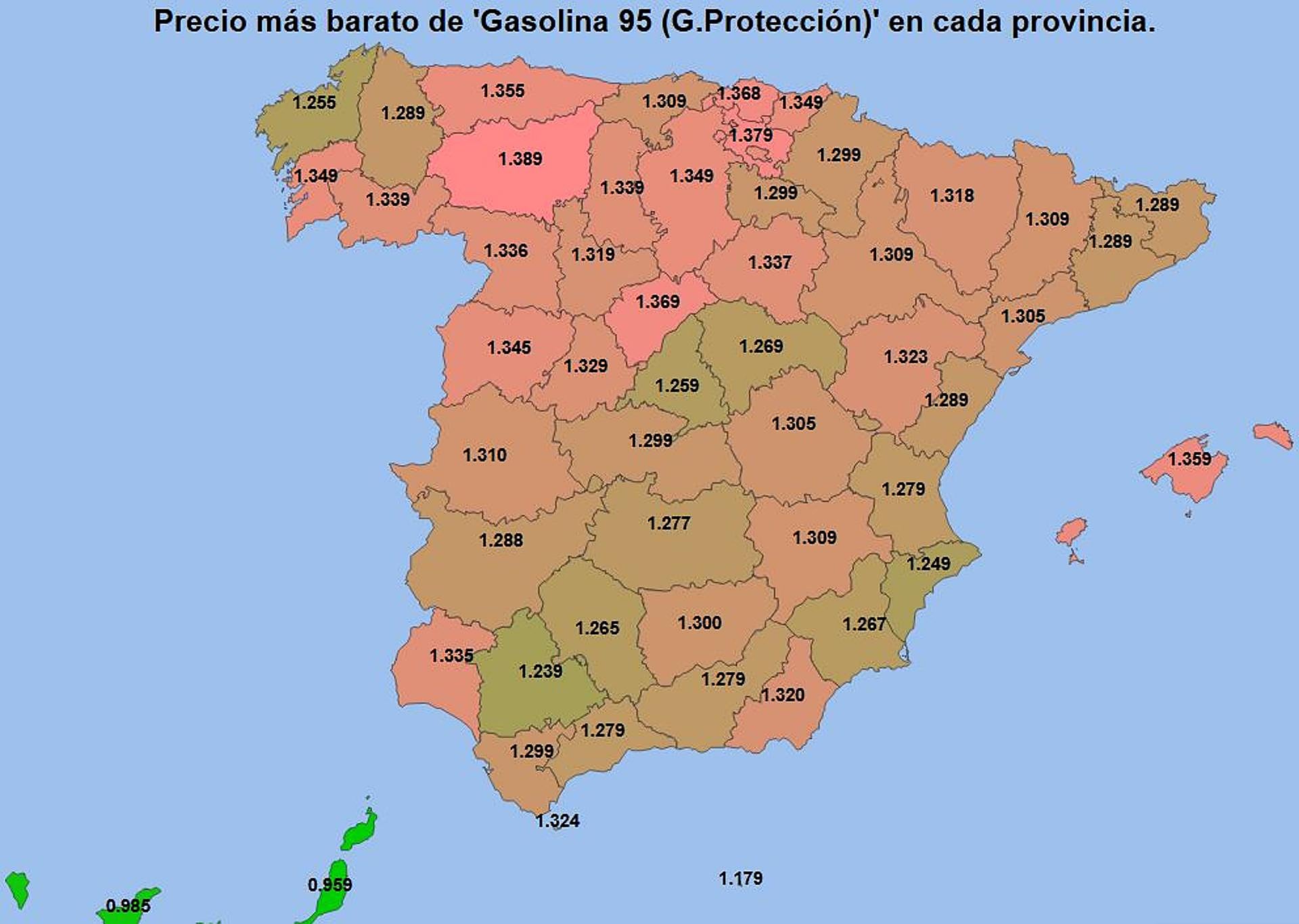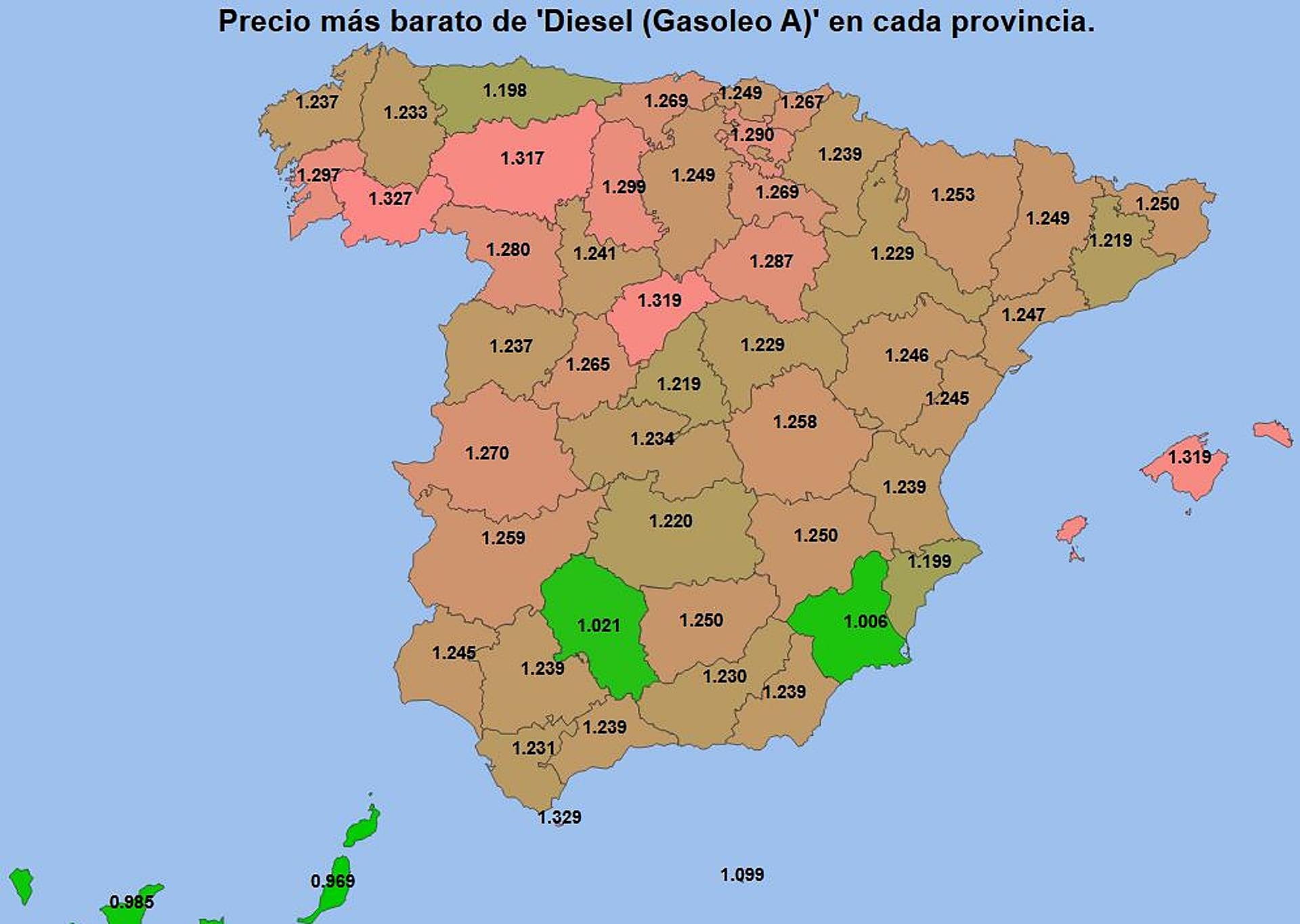 Excluyendo las islas Canarias (en Tenerife se paga a 0,985€ y en Las Palmas a 0,969€), Murcia es la provincia más barata a principios de diciembre, a 1,006 €/litro, mientras que en Córdoba se mantiene en 1,021€. En Asturias está a 1,198€, en Alicante a 1,199€ y en Madrid y Barcelona a 1,219€. En Melilla, en un ámbito más reducido, está a 1,099€.