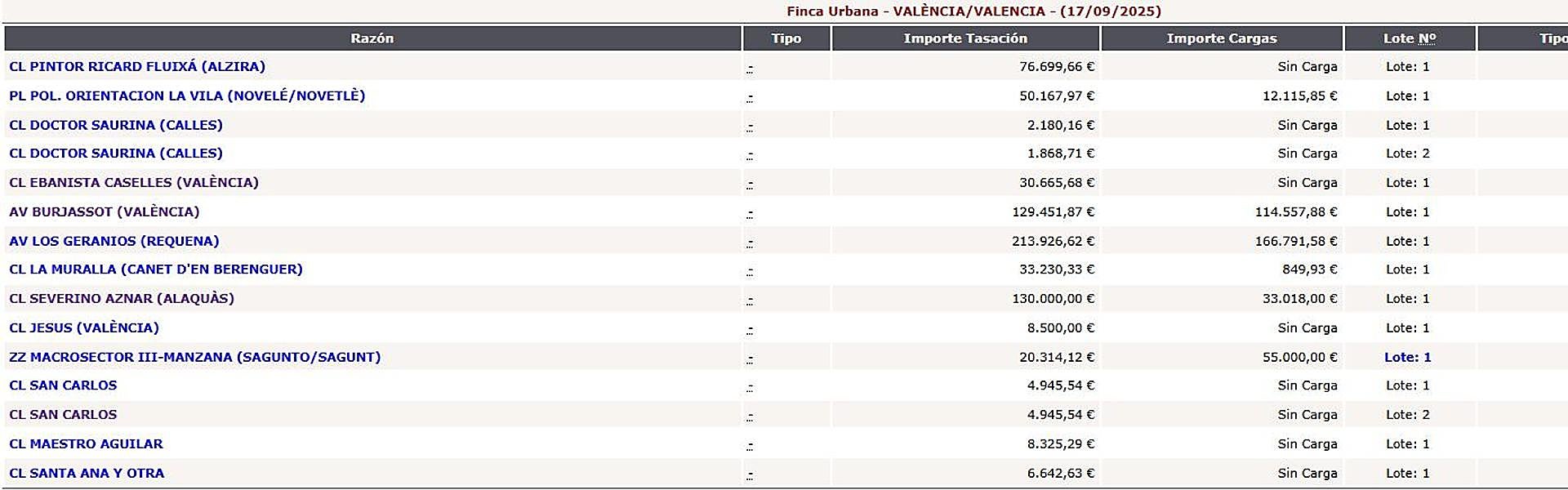 Para la subasta del 24 de septiembre, solo en la provincia de Valencia, hay 28 lotes: 9 fincas urbanas, 9 fincas rústicas y 10 vehículos. En total, entre septiembre y octubre, se subastarán 46 lotes, con presencia mayoritaria de coches (19) y con 15 lotes de fincas urbanas en la provincia de Valencia: en Alzira, Novetlé, Calles, Requena, Canet d'En Berenguer, Requena, Alaquàs, Sagunto y varias propiedades en Valencia ciudad, tanto en viviendas como plazas de garaje, con precios de salida entre 1.800 y 213.926 euros, y en algunos casos con cargas. Hay viviendas en la capital por 30.665,68, aunque solo se trata de una cuarta parte de la casa, y plazas de garaje por alrededor de 5.000 euros, y también se subastan parcelas de secano, huerta y arrozal.