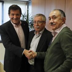 Los secretarios generales de CC OO y UGT, Ignacio Fernández Toxo y Pepe Álvarez, respectivamente, han recabado el apoyo del PSOE al proceso de movilizaciones que anunciaron el viernes por las restricciones del Gobierno al diálogo social después de reunirse hoy con el presidente de la comisión gestora del PSOE, Javier Fernández.