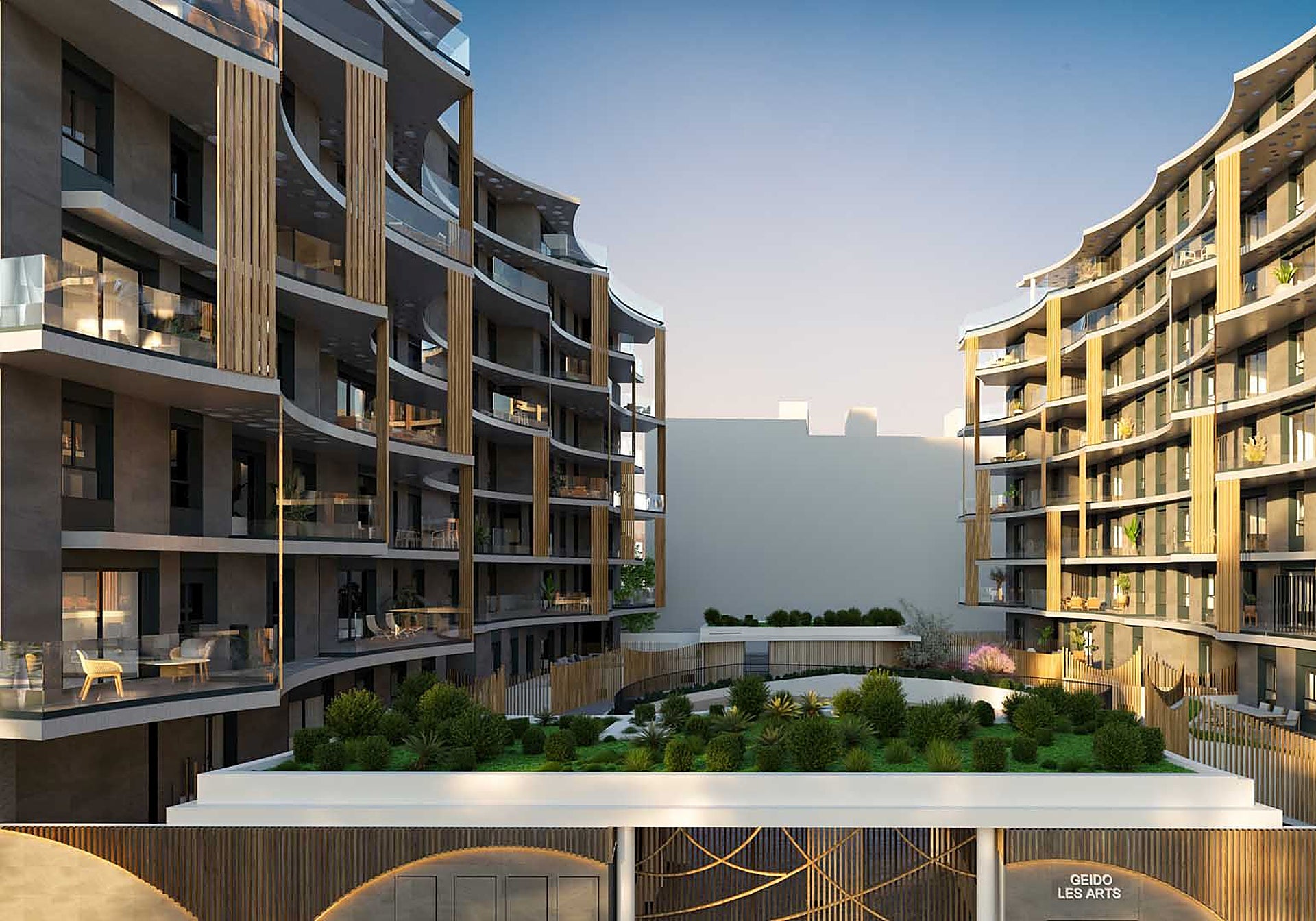 Por otro lado, Geido Les Arts ofrece una propuesta de vivienda urbana de alta gama con zonas comunes pensadas para la vida diaria: piscina para adultos y niños con solución salina, jardines, gimnasio acristalado, club social y área infantil. El diseño interior combina materiales naturales y líneas orgánicas, con pavimentos del grupo Porcelanosa, cocinas equipadas Siemens y carpintería de aluminio con rotura de puente térmico.