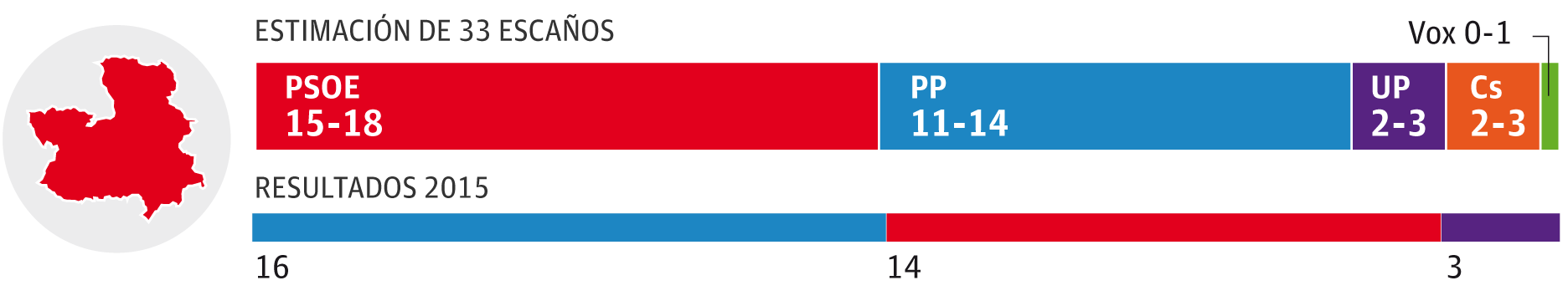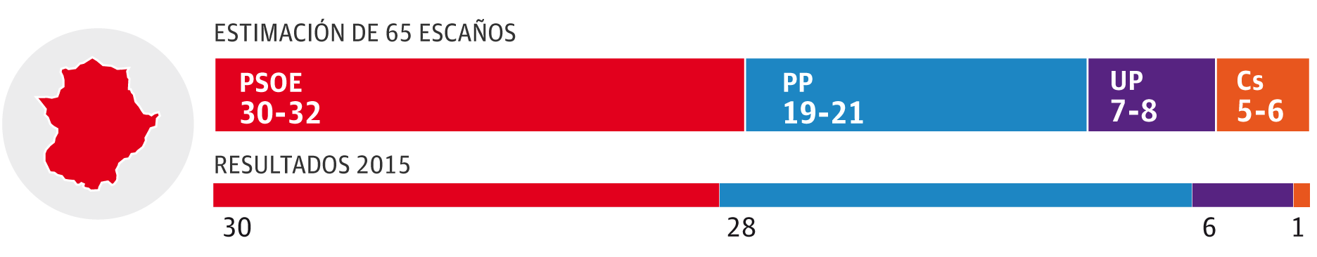 El actual presidente de Extremadura, Guillermo Fernández Vara, podría volver a renovar mandato en el caso de materializarse los resultados de la encuesta del CIS, sin embargo le haría falta pactar con el bloque de izquierdas o la abstención de, al menos, de Ciudadanos. Los socialistas rozarían la mayoría absoluta -que en el caso del parlamento extremeño se sitúa en los 33 escaños-, y obtendrían entre 30 y 32 escaños. El Partido Popular, por suparte, se desploma de los 28 escaños actuales a una horquilla de entre 19 y 21 diputados. Podemos pasaría de 6 a 7-8 y Ciudadanos aumentaría de 1 a entre 5 y 6 diputados. Vox, por su parte se queda fuera.
