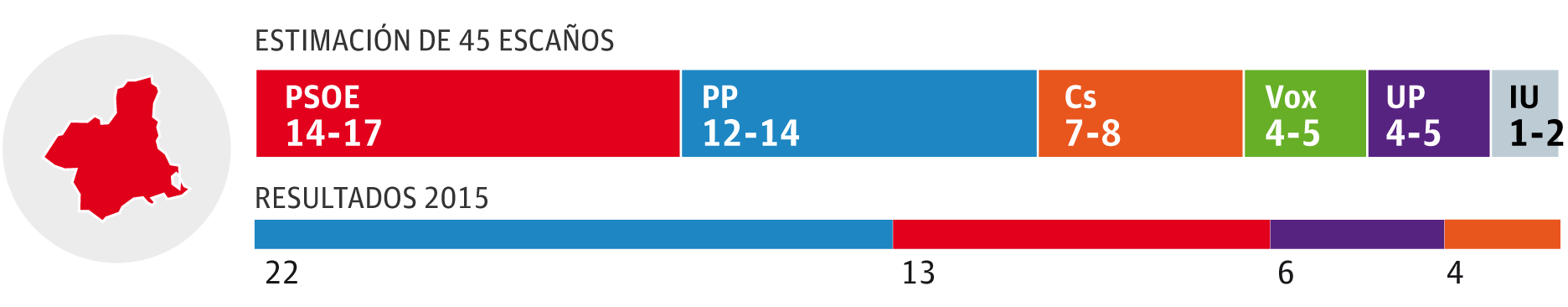 El PSOE podría conseguir la mayoría absoluta en Castilla La Mancha. La encuesta del CIS le da entre 15 y 18 diputados autonómicos (la mayoría absoluta está en 17), con lo que retendría el Gobierno de la comunidad. En todo caso, la suma con los 2 o 3 escaños que podría obtener Podemos le garantizaría la gobernanza: o, si fuera el caso, con los 2 o 3 escaños que conseguiría Ciudadanos, que entraría en el Parlamento autonómico. Por su parte, el PP pierde entre dos y cinco escaños, ya que lograría entre 11 y 14 diputados (ahora tiene 16) mientras que Vox podría conseguir un escaño (el CIS pronostica entre 0 y 1 para este partido). En votos, las izquierdas suman más del 51% (PSOE, el 40,3% y Podemos el 10,9%) mientras que las tres derechas se sitúan en el 45,2% (PP, el 29,8%; Ciudadanos el 8,6% y Vox, el 6,8%).