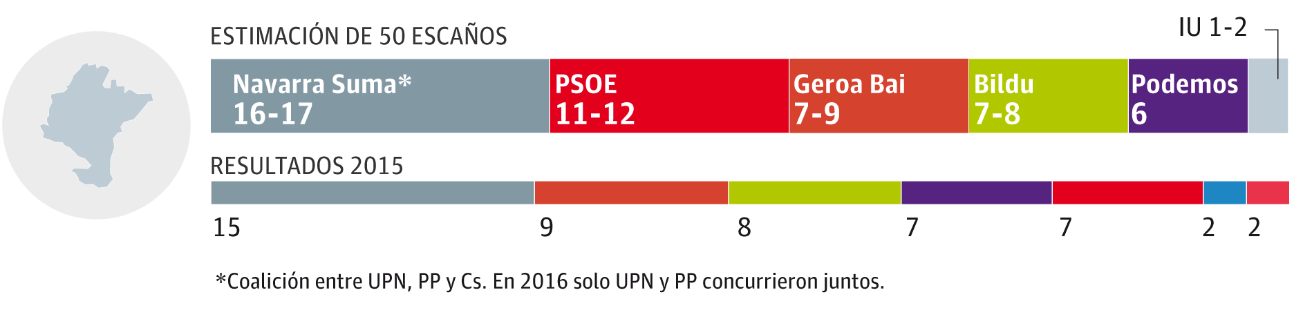 El Gobierno cuatripartito de Navarra perdería la mayoría parlamentaria obtenida en 2015. La suma de las cuatro fuerzas que sostienen el Ejecutivo de Uxue Barkos pasarían de los 26 escaños actuales a entre 21 y 25, por lo que el actual pacto entre izquierdas y nacionalistas necesitaría incorporar a los socialistas para mantener el Ejecutivo de la Comunidad Foral.