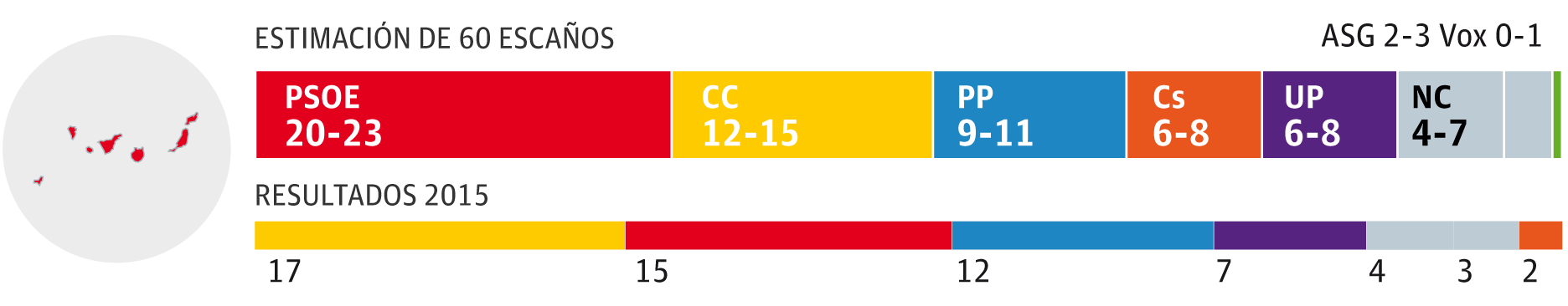 El Partido Socialista -que lidera Ángel Víctor Torres- podría alcanzar de 20 a 23 escaños de los 70 que conformarán la nueva Cámara regional y podría iniciar las negociaciones para hacerse con la presidencia con un pacto de izquierdas en el que entraría Podemos -que obtendría entre 6 y 8 escaños; y Nueva Canarias, que oscilaría entre 4 y 7 diputados.