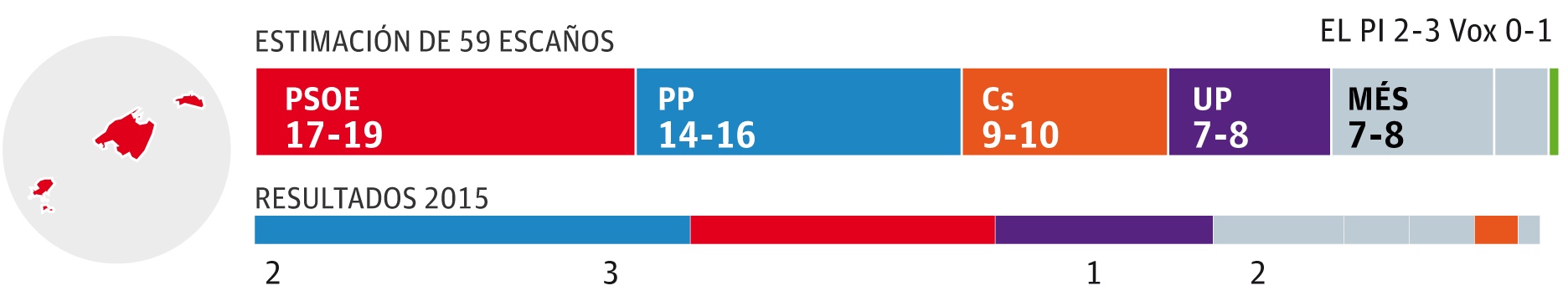 Baleares se confía a la izquierda con un acentuado ascenso del PSOE de Francina Armengol y el descalabro del Partido Popular, que bajaría hasta la cuarta fuerza política en las islas. La socialista volvería a repetir como presidenta del Govern si mantiene a sus socios de Podemos y Més. Según se describe en la encuesta del CIS el pacto de izquierdas está asegurado con el PSOE -que obtendría entre 17 y 19 escaños- mejorando de esta manera el resultado obtenido en las pasadas elecciones de 2015 para convertirse en la fuerza más votada con el 25,2% de los votos, quitando esa condición a los 'populares'. Cabe destacar la mejora de Ciudadanos -8 y 10 escaños- aaunque a la formación naranja no le valdría para agruparse con la derecha.