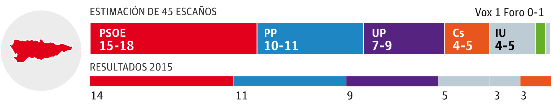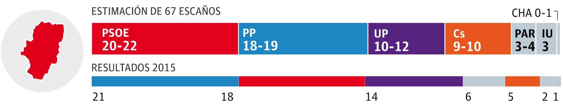 El PSOE, que ya ha gobernado 8 de las 10 legislaturas, volvería a ganar las en Asturias, según el CIS. Los socialistas serían el partido más votado, 30,8% de estimación de voto, con entre 15 y 18 escaños en el Parlamento asturiano, mejorando los 14 que lograron en 2015. Podemos, que tiene 9 escaños, los mantendría o bajaría a 7, siendo la tercera fuerza más votada (17%), mientras que IU obtendría entre cuatro y cinco escaños, los mismos o uno menos que en 2015. Mientras, el PP mantendría los 11 escaños actuales, aunque podría perder uno (con el 20,4% de la estimación de voto). Ciudadanos sube y pasa de tres escaños a cuatro o cinco y VOX consigue representación con un escaño.
