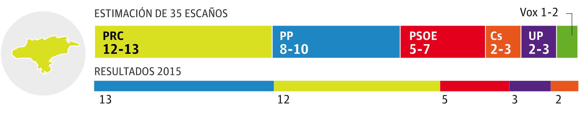 Miguel Ángel Revilla ganaría por primera vez las elecciones en Cantabria. Su Partido Regionalista Cántabro lograría el 33,8 por ciento de los votos, según el CIS, que le darían entre 12 y 13 escaños (en las últimas elecciones logró 12). Por su parte, el Partido Popular dejaría de ser la fuerza más votada y pasaría de los 13 escaños que tiene en la actualidad a los 8-10 que le otorgarían el 20,7% de la estimación de votos. Ciudadanos, que tiene dos escaños en la actualidad, seguiría con los mismos o podría subir uno más, mientras que VOX entraría en el Parlamento con entre 1 y 2 escaños. Por su parte, el PSOE mantendría los 5 escaños que tiene ahora o incluso podría subir a los 7 siendo la tercera fuerza más votada (18,1%) y Podemos, que en Cantabria no se presenta en confluencia con IU (que no obtendría representación), revalidaría los tres escaños que tiene en la actualidad, aunque podría quedarse en dos.
