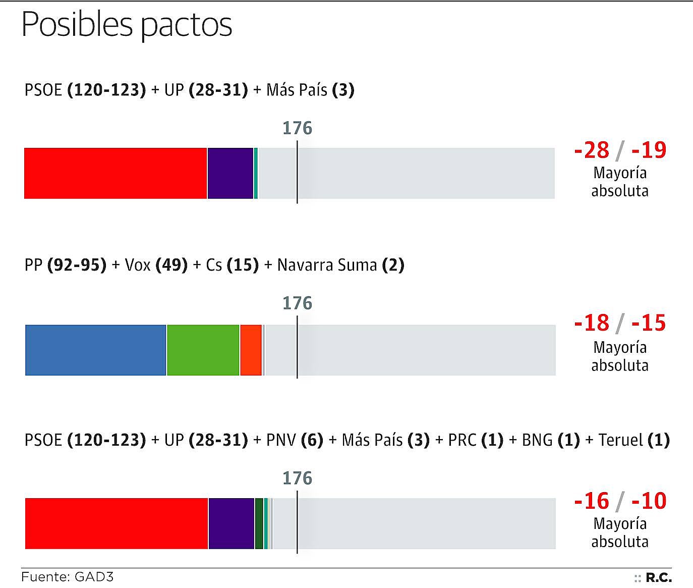 Con estos mimbres, la investidura se perfila como una tarea más endiablada que en junio. Ni la izquierda suma –se quedaría entre 148 y 157 escaños–, ni la derecha llega –se movería entre 158 y 161–. Eso sí, se deshace el empate a 43% de los votos de hace siete meses, y los conservadores cosecharían el 45% por el 41,4 de los progresistas.