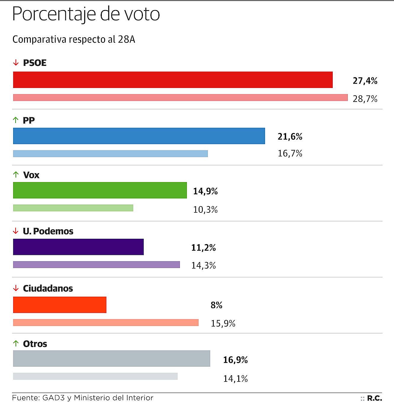 El PP ha visto frenada su carrera ascendente hacia los cien escaños que vaticinaban hasta ahora las encuestas, y obtendría entre 92 y 95 diputados, un importante salto respecto a los 66 de abril y que ratificarían a Pablo Casado como líder indiscutible de la oposición. Las causas del parón hay que buscarlas en el crecimiento de Vox, cuyo discurso de mano dura sin contemplaciones con el independentismo y el rechazo frontal a la exhumación de Franco habrían aglutinado en torno a Santiago Abascal el voto de la derecha más radical. El giro hacia la moderación de Casado, por otra parte, habría servido para recuperar para el PP voto de Ciudadanos, pero también habría provocado fugas a Vox. Soplar y sorber a la vez se vuelve a demostrar que es imposible.