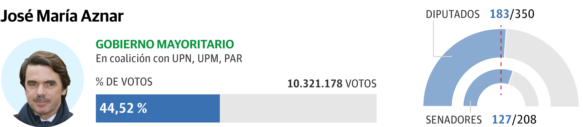 Aznar ganó por estrecho margen y tuvo que forjar una inédita alianza con CIU, PNV y Coalición Canaria. El PSOE pagó los casos de corrupción que afloraron en la anterior legislatura y el desgaste de 13 años de gobierno. IU logró los mejores resultados de su historia y los nacionalistas rentabilizaron su respaldo al PP con importantes concesiones.