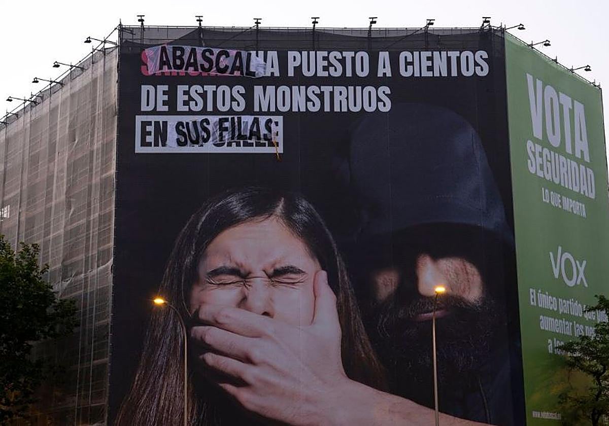 La lona electoral de Vox contra la ley del 'solo sí es sí' situada en el centro de Madrid y en la que arremetía contra el presidente del Gobierno, Pedro Sánchez, por las rebajas de condenas y excarcelaciones que ha ocasionado, ha aparecido saboteada este miércoles 19 de julio con un nuevo mensaje: «Abascal ha puesto a cientos de estos monstruos en sus filas».
