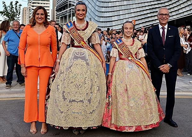 La primera edil ha lucido un traje de color naranja en homenaje a la ciudad, al espectáculo 'Llum' inspirado en el pintor Joaquín Sorolla y, sobre todo, en referencia a que el Roig Arena, la casa del Valencia Basket, se estrena en un acto fallero de esta envergadura abriendo así una nueva era de cara al futuro tras los 18 años de La Fonteta.