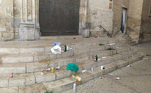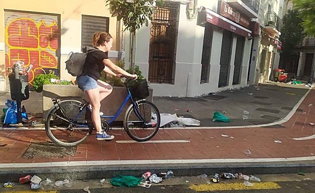 Las calles de Ruzafa han amanecido con los restos del botellón en numerosas zonas del barrio. El toque de queda no ha impedido las aglomeraciones de público y los vecinos se han encontrado con basura en jardineras, carriles ciclistas y hasta en los escalones de la iglesia de San Valero.