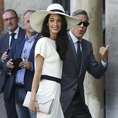 La abogada, entre las cien más reconocidas del mundo y especializada en derechos humanos, vestía una blusa y pantalones blancos acompañados por un cinturón negro y una pamela también blanca, mientras Clooney llevaba un traje gris con corbata. Como en cualquier matrimonio por lo civil en Italia se leyeron los tres artículos del código civil y fueron traducidos al inglés. El acto fue celebrado por el amigo de Clooney y excalcalde de Roma, Walter Veltroni, quien también ofició la ceremonia privada del sábado.