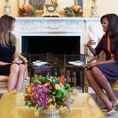 El primer encuentro entre el presidente elegido, Donald Trump, y el presidente saliente, Barack Obama llamó la atención por la sobriedad del momento. Paralelamente, se producía el segundo de los encuentros más esperados del día: el de las Primeras Damas. Michelle Obama recibió a Melania Trump en el Salón Amarillo del Despacho Oval, donde tomaron un té.