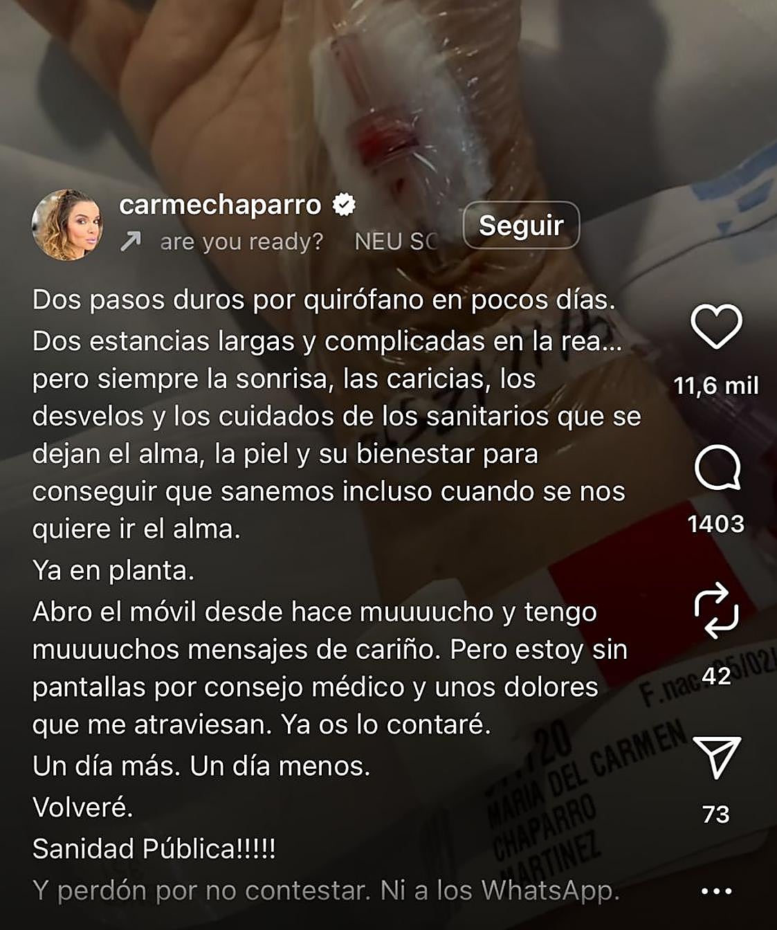 «Dos pasos duros por quirófano en pocos días. Dos estancias largas y complicadas en la rea… pero siempre la sonrisa, las caricias, los desvelos y los cuidados de los sanitarios que se dejan el alma, la piel y su bienestar para conseguir que sanemos incluso cuando se nos quiere ir el alma. Ya en planta», arranca la publicación que ha compartido Chaparro en redes sociales y en la que muestra su mano con una vía desde la cama de un hospital.