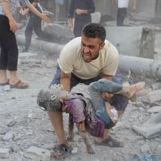 Un sirio recoge el cuerpo de su hijo de los escombros en una calle de Alepo.