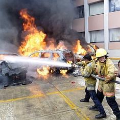 Los bomberos tratan de sofocar el fuego iniciado por los manifestantes en Chilpancingo