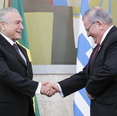 Michel Temer saluda a Kyriakos Amiridis, embajador griego en Brasil.
