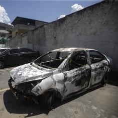 El vehículo del embajador griego en Brasil, calcinado en un depósito.