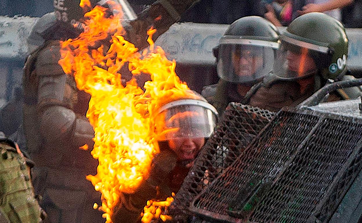 Desde el 18 de octubre, día en el que comenzaron las protestas por el encarecimiento de la tarifa del metro de Santiago, se suceden las manifestaciones al grito de «Chile despertó» y «renuncia Piñera». Se recrudecen las barricadas, los cortes de tráfico, los incendios y saqueos. En la noche del lunes en Santiago, Valparaíso, Concepción y Viña del Mar se registraron enfrentamientos con la Policía, que utilizó coches lanzaagua, gases lacrimógenos y armas largas con balas de goma. En la capital un grupo entró a la sede de la Universidad Católica y prendió fuego parte del mobiliario.