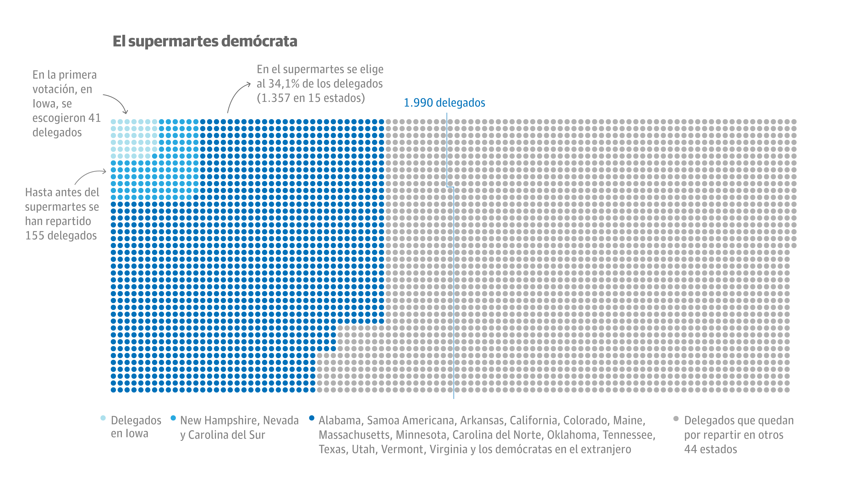En una fecha clave en el proceso electoral estadounidense, ya que es el día en el que más estados celebran elecciones primarias. En las elecciones de 2020, el supermartes se celebra el hoy en 15 jurisdicciones diferentes. En el caso del partido demócrata se pondrán en juego 1.357 delegados. En el caso del partido republicano, en el que el actual presidente Donald Trump no encuentra rival, se elegirán 782.